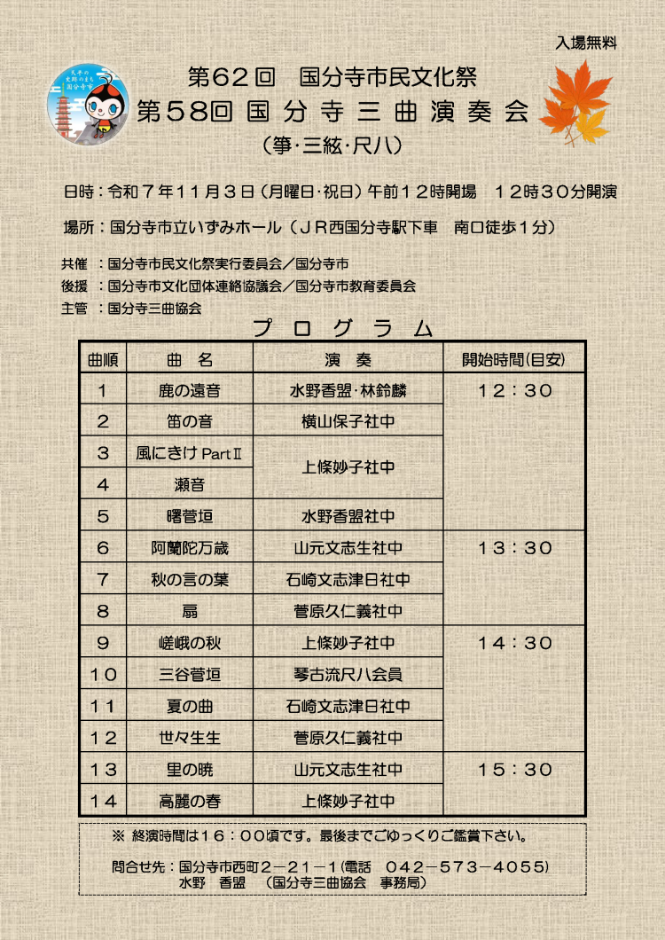 国分寺三曲協会は、東京都国分寺市に在住、出張稽古、または、勤務する各流、各派の箏、三絃、尺八の愛好者を以って組織されています。